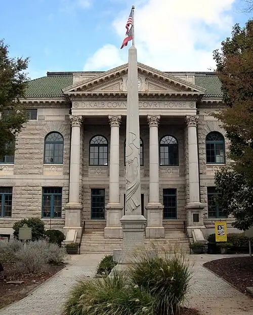 - π DeKalb History Center, 101 E. Court Sq (in the Decatur Courthouse). Step outside on the north side of the courthouse to view the "seated statues" and the south side to view the Decatur Square, home to various restaurants and prominently featured in TV and film productions, most notably HBO's 'Watchmen'. Walk down to West Trinity Place to see the History Center's historic complex of three antebellum structures.