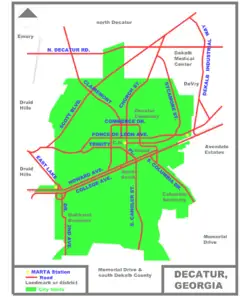 Decatur is accessible from Atlanta via Ponce de Leon Avenue, which is a direct route, but is a slow-moving surface street with many lights. It is also accessible from the Perimeter (I-285) via several exits, and indirectly via I-20. However, parking is limited in downtown Decatur. Street parking is free after 6PM MondayβSaturday and all day Sunday. The city website lists off-street parking lot locations.