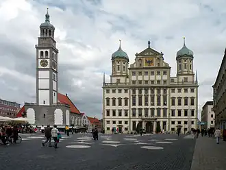 - 🌍 Rathaus, Rathausplatz 2. The city hall built in 1615–1624 by Elias Holl is a major example of Renaissance architecture in Germany. The Golden Hall (Goldener Saal, carefully reconstructed after World War II destruction) is in the 2nd storey and has a small entrance fee.