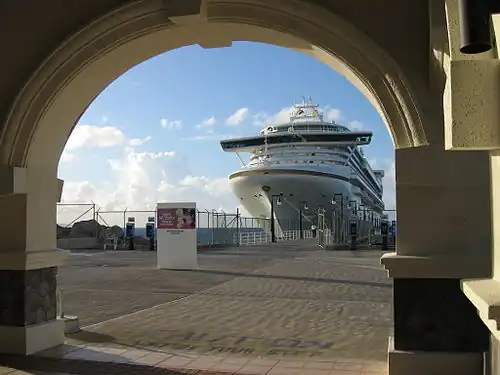 A large pier supports visiting cruise ships. Their passengers can walk directly through the "duty free" shopping area (noted in "Buy" below), and onward to the central downtown area.