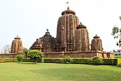 - 🌍 Chitrakarini Temple (Odia: ଚିତ୍ରକାରିଣୀ ମନ୍ଦିର) (north of Ligraj Temple Complex and east of Papanasini Temple Complex). The main shrine consists of jaghmohan and vimana. The four corners of the complex houses four subsidiary shrines, consisting of vimana only. The temple was probably constructed in the middle of 13th century and was commissioned by Narasingha Deva I (also known as Parama Mahesvara). The temple lies in beautifully manicured gardens with flower beds maintained by the ASI. Goddess Chitrakarini is an incarnation of Devi Saraswati, but the present presiding deity of the temple is Chamunda. The main temple and the subsidiary shrines have their share of external ornamentation. Most of it has eroded away or has been damaged.