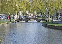 Bourton-on-the-Water is famed for its picturesque High Street. Lying on the meandering River Windrush with several low arched stone bridges resulted in the village becoming known as "Venice of the Cotswolds".