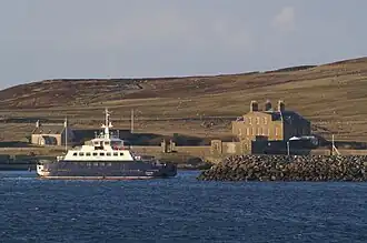Car ferries sail from Lerwick, leaving from the Albert Building (the big red corrugated metal building) in town centre. The ferry is a small ro-ro sailing daily, hourly from 7AM to 11PM (F Sa to 1AM), a ten minute journey. Until April 2025, the return fare is £2.80 per adult, child or conc £0.80, car and driver £16.50, pay on board outbound. The landing in Bressay is at Maryfield next to the Heritage Centre; there are toilets here and on the ferry.