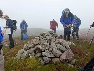 - π Beinn na Caillich: There are two mountains of this name on Skye, this one is the 732 m / 2402 ft summit behind Broadford, the first big peak you see on the road across Skye. The path ascends from Coirechatachan on A87 (Grid ref NG619227). It's a steep slog, with the path often lost under boulders. (Dr Johnson and Boswell thought about climbing it, but wimped out.) The slope is convex so you don't see the summit until the top. There's a very large summit cairn, said to be the burial place of a Norse princess. From here you can retrace your steps, or continue to the lower summits of Beinn Dearg Mhor and Beinn Dearg Beag then down to the road.