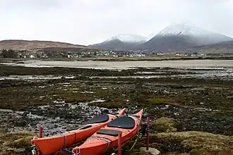 Broadford (Gaelic: An t-Γth Leathann) is a village straggling along the main road across Skye in the Scottish Inner Hebrides. All island routes converge here so you're bound to pass through it. Its name refers to the "broad fjord" of the bay, not the river crossing, but historically it meant only the western settlement around that crossing: Harrapool, Sculamus and Breakish are the eastern extension of Broadford. The population in 2020 was 1170.
