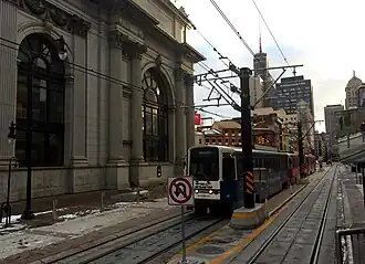 The Metro Rail is an LRRT line that extends along Main Street from the University at Buffalo's South Campus in North Buffalo southward to downtown. The northern portion of the system is a subway, but as it enters downtown it emerges from its tunnel and runs at street level. Riding on the above-ground portion of the Metro Rail — from Fountain Plaza Station near Genesee Street southward to Erie Canal Harbor Station — is free, and is a pleasant and efficient way to travel from one end of downtown to the other. It's important to note, though, that travelers who continue northward past the Fountain Plaza Station without having paid a fare ($2 one-way/$4 round trip) may incur a substantial fine.