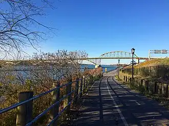 Buffalo's oldest, largest, and best-known bike path is the Shoreline Trail, a multi-use trail that connects the Bethlehem Steel site in Lackawanna to Gratwick Park in North Tonawanda via the West Side waterfront, for a total distance of 22.6 miles (36.4 km). The Shoreline Trail passes into the West Side near the posh Waterfront Village condos and closely hugs the shore of Lake Erie and the Niagara River for its length, with excellent views over the water and easy access to many waterfront attractions including LaSalle Park, the Fontana Boathouse, Freedom Park, Unity Island Park, and Riverside Park. Best of all, for the vast majority of its length, the Shoreline Trail follows its own off-street right-of-way with no traffic to contend with β the exception is a short, unsigned stretch of 0.4 miles (700 m) along Busti Avenue and Niagara Street between Hampshire and West Ferry Streets, but the roadway boasts wide shoulders and sidewalks that provide a modicum of safety for cyclists. The trail is paved with asphalt in its entirety, and a speed limit of 15 mph (24 km/h) is enforced.