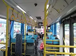 Seating arrangements on city buses vary by vehicle regardless of class, but most should have room for 38 (2-2 seating) or 41 (2-3 seating). Seats always face to the front of the bus on most vehicles, but newer low-floor vehicles will have bench or rear-facing seats near the front door, space for wheelchairs and strollers, and hanging straps and grab bars for standing passengers. Regardless of vehicle type and seating configuration, seats near the front door are priority seats reserved for passengers with children, elderly persons, and people with disabilities; you should give those seats to those groups of people whenever they need it. Priority seats are marked with a sign (often the international accessibility symbol) pasted on the window beside the seat.
