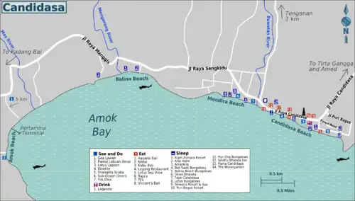 Candidasa (or Candi Dasa, pron. "CHAHN-dee-dah-sah") is a coastal town in East Bali. This is a laid back and very relaxing area of Bali with a wide range of accommodation options. Many visitors, especially Europeans, combine a stay in the hotspots of south Bali with a more relaxed break here. The black sand beaches are very narrow and often disappear altogether at high tide.