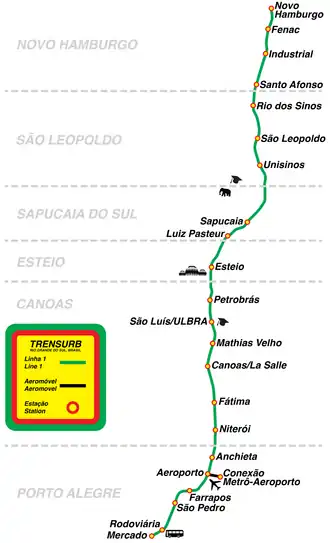 Locals call it the TRENSURB. You can take the train from the airport to many stops in Canoas and to cities beyond (Porto Alegre, Esteio, Sapucaia do Sul, São Leopoldo and Novo Hamburgo). The fare is R$1.70 and there's a station near the Porto Alegre Rodoviaria (central bus station) and Porto Alegre Salgado Filho airport. It is more or less safe to walk during day time from Rodoviaria or the airport to the stations.