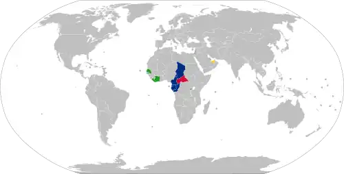 The currency of the country is the Central African CFA franc, denoted FCFA (ISO currency code: XAF). It's also used by five other Central African countries. It is interchangeable at par with the West African CFA franc (XOF), which is used by six countries. Both currencies are fixed at a rate of 1 euro = 655.957 CFA francs.