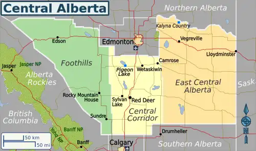 Central Alberta is part of Alberta, located between the cities of Calgary and Edmonton. The eastern portion is largely agricultural, while the western portion is part of the foothills of the Rocky Mountains.