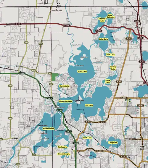 The Chain O' Lakes is a region in the northwestern part of greater Chicagoland which is composed of 15 lakes connected by the Fox River and man-made channels. Located in the Lake County along the Wisconsin border, it is generally centered around the Village of Fox Lake but includes much of the greater area.