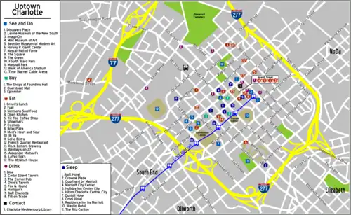 - π Marriott City Center, 100 Trade St, β +1 704-333-9000, fax: +1 704 342-3419. Check-in: 3PM, check-out: noon. A good value with immediate access to the center of the city. A short walk from the Convention Center. Location is excellent for nightlife, as it is on one of the safest and best-lit blocks in the city. A bit pricey, but surprisingly luxurious for its price range. Valet, restaurant, pool, parking deck. $99-169.
