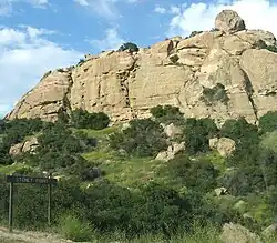 - Stoney Point, 11000 Topanga Canyon Blvd (street parking on Topanga or on Chatsworth), ☏ +1 818 756-8189. daily 6AM-6PM (i.e. sunrise to sunset). Great hiking trails, also popular with mountain climbers. Dog friendly. No snackbar or washroom facilities. Bring your own water. Prepare to spend hours of discovery on this hike at Stoney Point in Chatsworth where boulders merge together to form caves, dens, and alcoves that beg to be explored, culminating in a landmark massif called Stoney Point. There is a wide trail following the base of the mountain along the south and east sides that is easily traversed with dogs. Get on the trail below “Stoney Point” and follow it around toward the east. A cluster of boulders form a good-sized cave at a small clearing to the left about midway to the east side of the mountain. A sharp eye can spot it from the trail. Look for a hitching post rail on the opposite side of the trail. Parking on Topanga Canyon Boulevard is dangerous with dogs. It’s better to take the back way by parking on Chatsworth Street near the railroad crossing west of Canoga Avenue. Follow the bridle path along the tracks heading north. A natural feature definitely worth visiting.