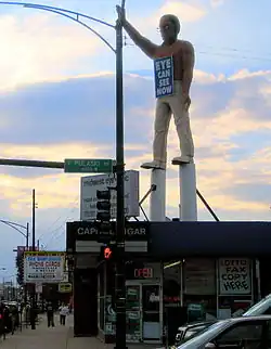 - Capital Cigar Store Inc (The Indian Building), 6258 S Pulaski Rd. Forget the store, this place is famous for the giant stereotypical-looking Indian statue of Wayne's World fame on the roof. In the movie, his hand is raised in greeting, but he has an arrow through his back. The Midwest Eye Clinic has usurped the cigar sellers, and adopted the Indian as a billboard — the arrow is gone, he now wears large glasses, and bears an odd sign reading "Eye can see now."