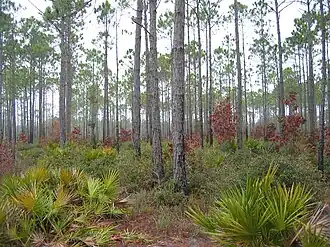 The generally flat terrain of the forest is pocked by bays, sinkholes, and swamps. Some soils are excessively drained, others poorly drained. The largest area of natural forest is dominated by longleaf pine and slash pine with an understory of palmetto, gallberry, and wiregrass. The Munson Sandhills just south of Tallahassee have turkey oak and bluejack oak, species favored by the deep well-drained sandy soil, as well as pine.