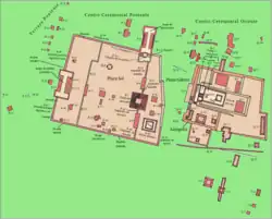 - Eastern Ceremonial Center: includes residential structures, a marketplace, and a smaller ceremonial platform. The platforms in both the Eastern and Western Ceremonial Centers likely had structures built on top of them when the city was alive.
