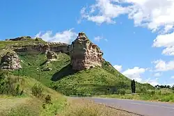 Clarens is part of the scenic Highlands Route and is surrounded by mountains. The Rooiberge is the range encompassing the village, whilst further towards the southeast are the Maluti mountains in shades of purple and blue. All around are the sandstone cliffs with their multi-coloured layers - these horizontal strata are a characteristic feature of the area. Many homes in the Clarens Valley are made from or clad in sandstone.