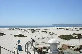 - π Central Beach, along Ocean Blvd on the south side of the island. Coronado has a splendid beach, made up of beautiful white sand and the crowd is mostly families enjoying the day. If you look closely you can read the name Coronado in the sand dunes close to the Hotel del Coronado. A small tidepool area in front of the Hotel Del gives you a chance to explore a bit. There's plenty of free parking along Ocean Blvd, but it fills up quickly during the summer. At the north end of the beach, up by Sunset Park, the beach is open to dogs as well as bonfire pits and surfing. Surfing is also allowed in-front of the "Shores" just south of the Hotel Del. Lifeguards on duty seasonally. Restrooms and showers available.