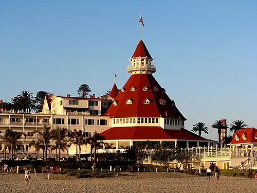 - π Hotel del Coronado, 1500 Orange Ave, β +1 619-435-6611. The hotel's architecture is a must-see, with its brightly colored wooden Victorian style exterior and its slightly dated art deco interior. Built by hand in 1888 by two railroad engineers, it is today a National Historic Landmark and has been a favorite location for films (including classics like Some Like it Hot) and weddings. Many presidents and celebrities like Babe Ruth and Marilyn Monroe have stayed here. You can view it from the beach or Orange Avenue.