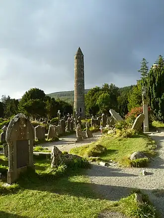 - 🌍 Wicklow Gap further south is likewise the top of a pass at 475 m (1558 ft), but loosely applies to the scenic road R756. Westbound this starts from Laragh and passes the monastic complex at Glendalough, then climbs Glendasan. There are two car parks near the crest from where you can climb Turlough Hill and Camaderry to the south, or just stroll round the little corrie lake at their foot, or climb Tonelagee to the north. The road then descends into the valley of King's River, with St Kevin's Way hiking trail parallel. Stay on R756 to reach Hollywood or turn north on R758 by the lake shore to reach Blessington.