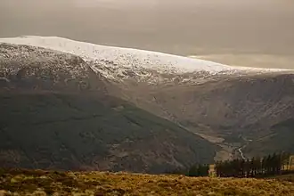 - - Mullaghcleevaun at 849 m (2785 ft) is climbed from the southeast, from Oasis car park on R115 above Laragh. It can be combined with Duff Hill (720 m), Gravale (718 m) and Carrigvore (682 m) before descending into Sally Gap.