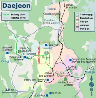 Daejeon is 167.3km from Seoul, 294km from Busan and 169km from Gwangju. It is also close to the proposed site of a new administrative city, Sejong City