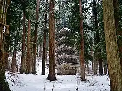 - The well-marked trail from the base of Hagurosan winds its way through the forest for a while, passing the beautiful wooden Gojū-no-tō (五重塔 Five-Story Pagoda) along the way. Built some 600 years ago, the pagoda is registered as a National Treasure.