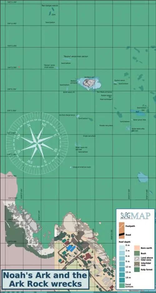 - 🌍 Seal Rock: S34°15.3370' E018°28.8920' — A fairly large flattish rock used as a haulout rock by seals with fairly shallow reef around it.