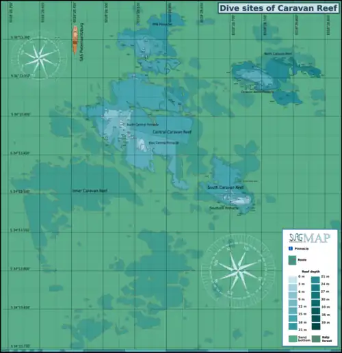 - Reef dive. Boat access only. Maximum depth about 21 m.