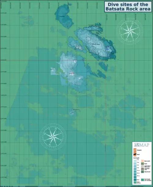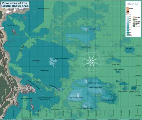 - Reef dive. Boat access only. Maximum depth about 30 m.