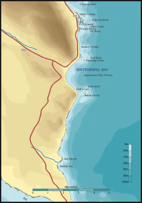 A small group of dive sites just to the south of Smitswinkel Bay. They are inaccessible by land due to the steep cliffs along the shore and lack of nearby roads.