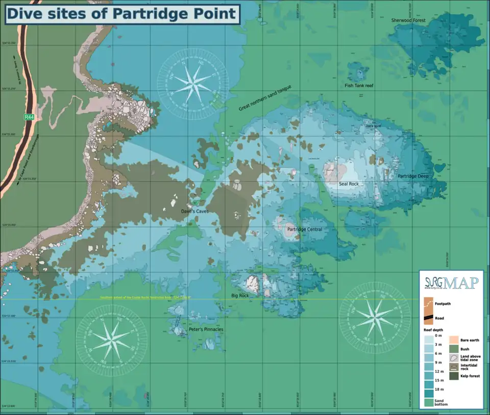 - 🌍 Partridge Point - Big Rock: S34°15.4650' E018°28.7880' — A large exposed rock marking a moderate depth area of high profile reef with a large swimthrough and a small air-trap overhang. Maximum depth about 21 m on the sand to the south and east.