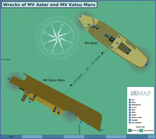 - The 340 ton, 27 m long Motor Fishing Vessel "Aster" was a South African registered lobster fishing vessel which was prepared as a diver-friendly artificial reef by cleaning and cutting openings into the structure and was scuttled in Hout Bay near the wreck of the "MV Katzu Maru" on 9 August 1997. It has been used as a training site for wreck penetration. The vessel is upright on the bottom and is beginning to break up.