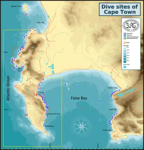 - Dive sites of the Cape Peninsula east coast, also known as Dive sites of False Bay west coast,