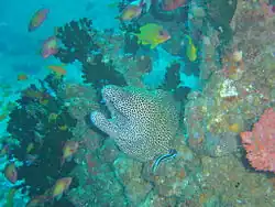 Honeycomb moray, Bluestreak cleaner wrasse, Small red wrasses, Red spined stars, Red-brown bowl sponge, Old woman Pomacanthus rhomboides, Goldies, Greentree corals, Epaulette soldiers, Dominos, Crown squirrelfish, Red sea fans, Maroon sponges, Spotted unicorn fish, Surgeonfish, Dusky rubberlips, feather stars, Blue tangs, nudibranchs.