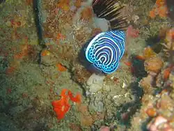 Wide variety of fish and reef invertebrates: Anemone fish, Two bar clownfish, Devil firefish, Emperor angelfish, Scorpionfish, Balloon porcupinefish, Longnose butterfly fish, Whitespotted butterfly fish, bluestreak cleaner wrasse, Spotted hawkfish, Dominoes, Yellowback fusilier, Spotted hogfish, Five lined cardinal fish, Paperfish, Honeycomb moray, Cave bass, Moorish Idols, Blue tangs, dark surgeonfish. Toby, Blacktip kingfish. Cushion stars and other stars, sea cucumbers, nudibranchs, shrimps, lobster, Thistle soft coral, Egg cowrie, yellow bowl sponge, Trumpet fish, zigzag oyster, Fleshy soft coral, giant anemone, Various sponges, Tube anemone with light blue tentacles, Greentree coral, Black feather stars, orange encrusting sponge, small purple, yellow and black colonial squirts, honeycomb coral, Small brown and yellow crabs, Warty off-white cucumber, brown star,