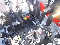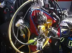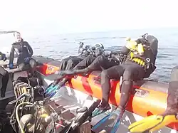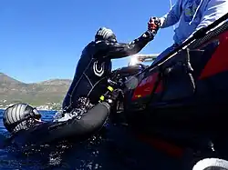 Getting into the water is usually done by a synchronised backward roll – falling into the water alongside your neighbour, neither on top nor underneath. Generally all the divers or a nominated group will roll off together, on a countdown from the skipper or divemaster. It is important to all roll together, as if you do not, the later divers may fall on top of the earlier ones, possibly casing injury or equipment damage. If you are not ready, or are not happy with this procedure, wait until the others are in and the boat is clear of them. The skipper will then let you roll in clear of the others, but you may have to fin a bit to get to them. This can be a problem if diving in a current. Some divers may not wish to backward roll with a large camera setup. They can ask the skipper to pass the camera to them when in the water. In this case they should stay close to the boat and preferably hold onto it until their camera is passed down.