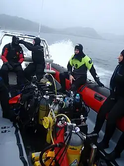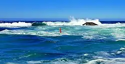 Two places which may experience significant currents are at the mouth of False Bay, at Rocky Bank and Bellows Rock, where eddies from the Agulhas current frequently produce a light- to medium-strength current, which may be strong enough to inconvenience divers in the shallows around Bellows Rock. Occasionally currents of up to about a knot have been experienced at offshore dive sites in False Bay south of Simon's Town, and on the Atlantic seaboard near Duiker Point and Robben Island. These currents are usually considerably weaker at the bottom, and do not usually present much difficulty to divers, though they make the use of a DSMB for surfacing more important, as one can drift quite a long way even on a normal ascent with a safety stop. These surface currents can be more of an inconvenience at the start of the dive, as they will carry you past the shotline if you are not prompt about descending, which should be done as soon as the line is in view. Also, depending on the slack in the shotline, the buoy will be downwind and downcurrent of the mark by several metres. A competent skipper will make some allowance and drop the divers in upstream of the buoy. Competent divers will descend as soon as they can see the shotline, to avoid drifting past the mark. In many cases it will not matter much to descend a bit off the mark, but for wrecks overshooting the mark can mean missing the wreck altogether.