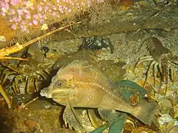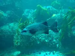 Reef fish of this region are most varied in False Bay, and most common in the restricted zones of the Marine Protected Areas, where they have been protected by law for several decades, though poaching still occurs, and enforcement is quite unreliable. Most of the reef fish are camouflaged to some extent. Many are silvery grey and countershaded, like the ubiquitous Hottentot seabream, the silvery Fransmadam and the Steentjie. Others have vertical bars or dark patches which may help break up their profile in kelp, such as White stumpnose, Zebra, and White steenbras, while many of the smaller species are cryptically coloured and blend very well into their environment. These are generally fish which spend most of their time on or very close to the reef, and their coloration is usually an indication of the typical colours of their habitat. These include various endemic klipfish, and a few blennies and gobies, the fingerfins, Cape triplefin, Smoothskin scorpionfish, two species of horsefish, a pipefish and the Rocksucker. There are also a few red fish, which are fairly visible, such as the very common Roman, and the less common Red stumpnose and Red steenbras. Most of the fish mentioned are solitary or found in small shoals, but there are also Strepies and Maasbanker which tend to shoal in fairly large numbers, and moderately large shoals of Hottentot are seen quite frequently. Galjoen are fairly rare and usually seen in small groups on top of the reef where there is a lot of wave movement, and the similar looking Cape knifejaw prefers deeper and high profile reef between the rocks. Seacatfish are shy and tend to spend the daytime in crevices and holes.