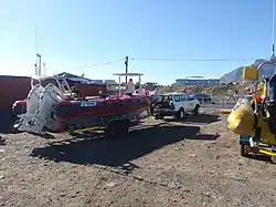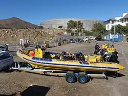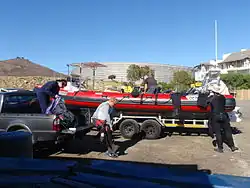 Getting out onto a beach is unusual in Cape Town, but relatively straightforward. It is usually safer and more convenient to get off on the low side if the boat tilts when running up the beach. If you are on the high side, wait until there is space and move to the low side, or in some cases the high side will become the low side as the boat flops back as the load is removed. Don’t try to unload kit over the high side, in case you are in the wrong place and the boat rolls down on top of you. This is particularly likely if the boat is not fully clear of the waves.