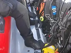 Some boats have no footstraps. You will have to find something else to hold onto, or lean into the boat to keep more weight on your feet. Some divers may be seen comfortably sitting on the tubes, riding the waves with no obvious concern as the boat bounces along. They may not even need to hold on. They have done this before.