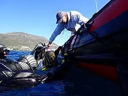 False Bay is a destination noted for whale watching. Large numbers of Southern Right whales visit the bay every year, but it is unusual to see one during a dive. Other whale species occasionally seen in False Bay are Humpback whales, Bryde's whales and Orca, and these are even less likely to be seen while diving. If you do have the good luck to encounter a whale during a dive, be careful, as their huge size makes it easy for a diver to be injured unintentionally.