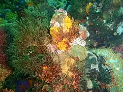 Benthic invertebrates provide most of the bright colours on the reefs of this region, and the distribution of species is as characteristic of the different sub-regions as the depth and water temperature. The diversity is large, and there is a big variation in the predominant reef cover with both depth and geographical location. The characteristic reef life varies considerably between the east and west sides of the Cape Peninsula, and this is recognised as the border between the South Western Cape and Agulhas Inshore Bioregions. The vertical zonation is also characteristic of the different bioregions, so there can be very noticeable differences in what can be seen at the various sites.