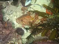 The great majority of popular dive sites in the local waters are on rocky reefs or mixed rocky and sandy bottoms, with a significant number of wrecks, which are equivalent to rocky reefs for classification of habitat, as in general, marine organisms are not particular about the material of the substrate if the texture and strength is suitable and it is not toxic. For many marine organisms the substrate is another type of marine organism, and it is common for several layers to co-exist. Examples of this are red bait pods, which are usually encrusted with sponges, ascidians, bryozoans, anemones, and gastropods, and abalone, which are usually covered by similar seaweeds to those found on the surrounding rocks, usually with a variety of other organisms living on the seaweeds.