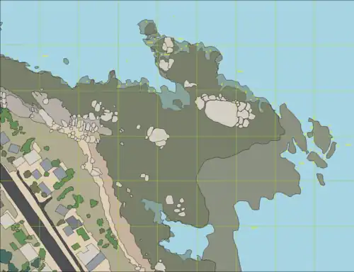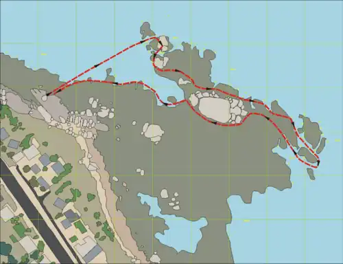 - Entry at South entry, out on snorkel through barrier rocks to south side of big rock. Dive down and along the big rock, then further following the gully to a big pinnacle on sand bottom at 10 m, past on the south side, across to the next group of rocks across a sandy gap, round the south side, north along the outer face, north over sand to the black mussel beds, then back toward the shore, passing between the big rock and north groups, back to the south entry area and exit at the north side between big boulders on a sloping rock.