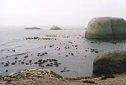 The south entry area is more sheltered in some conditions, but the north entry is often more convenient as there is less kelp to swim through. In the right background is the Big Rock. In the centre foreground is one of the south entry points to the right of the boulders. You can get out of this entry area through the gaps to left and right of the middle rock group. The large grey rocks are granite corestones, and the smaller rounded boulders are mostly sandstones from the overlying strata of the Peninsula Formation. South entry is very convenient as there is a nice flattish rock to rest a camera while putting on fins. This entry might be a bit rough in heavier swell. There is quite a long swim through dense kelp to get out of shallows, which is a bit awkward with camera or SMB, but should be OK without.