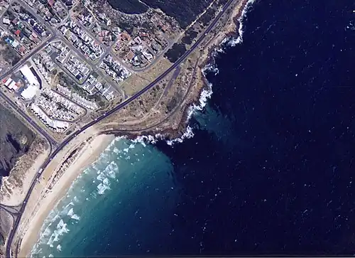 Off-road parking is available at the "Simonβs Town" Sign just before Glencairn at S34Β°09.384', E018Β°26.117'. Shown in the aerial photo as a strip of tarred surface joining the main road near the top of the picture. The path starts at a gate in the fence at the top of the parking lot, near the white wall with the Simonβs Town sign. Cross the railway line and walk down to the sloping sandstone ridge (top centre). Enter and exit from the north side of this ridge at a position which suits the state of the tide. Dive to the east and north of the entry point.