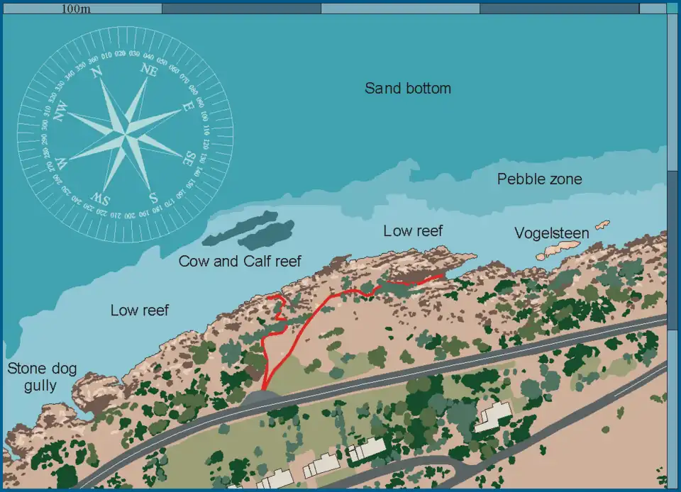 Shore dive: Access includes a bit of a climb. Park at Five Houses on the Faure Marine Drive (R44) from Gordon’s Bay to Rooi-Els. The parking bay is at S34°10.357’ E018°50.278’ on the seaward side of the road directly opposite three palm trees in front of a group of five houses that stand alone above the road outside Gordon’s Bay. The path leads north-east through the bush to the top of a gully, and down the gully to the water. There is a ledge on the seaward side of the gully which gives access to the water beyond the shallow area with boulders, and is convenient if there is a bit of a swell running.